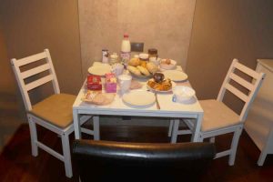 Gegenüber der gemütlichen Sitzecke steht ein kompakter Esstisch neben einer Kommode mit drei Fächern, gefolgt von einem geräumigen Kleiderschrank. Statt des großzügigen Schranks hätten wir jedoch lieber einen größeren Esstisch bevorzugt. Der Esstisch lässt sich nicht ausziehen und erweist sich als ungeeignet für drei Personen. Daher mussten wir einen zusätzlichen Stuhl aus dem Schlafzimmer holen und beim Essen besonders vorsichtig sein.