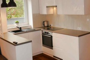 Die Küche ist in den Wohnbereich integriert und präsentiert sich als offene Gestaltung. Sie ist funktional und platzsparend konzipiert, bietet jedoch ausreichend Raum für zwei Köche, um gemeinsam Gerichte zuzubereiten und zu kochen. Der Backofen eignet sich hervorragend zum Zubereiten von Pizzen oder anderen Speisen, allerdings fehlt eine Mikrowelle für das schnelle Erwärmen von Milch und anderen Lebensmitteln. Bei der Ausstattung wurde auf hochwertige Technik von AEG gesetzt, während das Geschirr von IKEA stammt.
