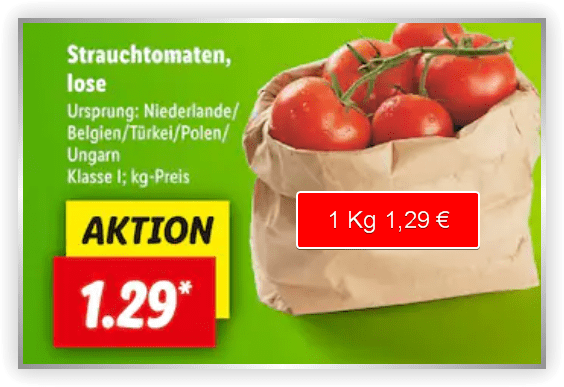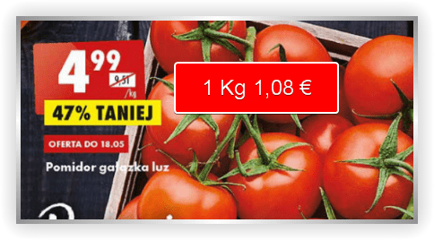 Ein Preisvergleich rechnet sich. Ausgehend von den Angebotspreisen der deutschen und polnischen Discounter, zahlt der polnische Kunde nur etwa 85 Prozent von dem, was ein Kunde in Deutschland für 1 Kg Strauchtomaten bezahlt. Noch günstiger bekommst Du Tomaten auf den vielen Märkten in Grenznähe.