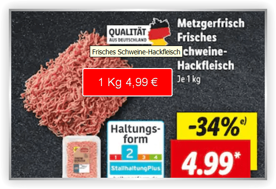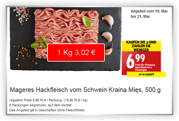 Hackfleisch, bei uns Gehacktes genannt, ist ein integraler Bestandteil vieler Gerichte in den beiden Ländern Deutschland und Polen. Ein Preisvergleich lohnt sich für Grenzgänger, welche im Grenzgebiet wohnen und sowieso fast täglich nach Polen fahren, um von den erheblich günstigeren Diesel und Benzinpreisen zu profitieren.