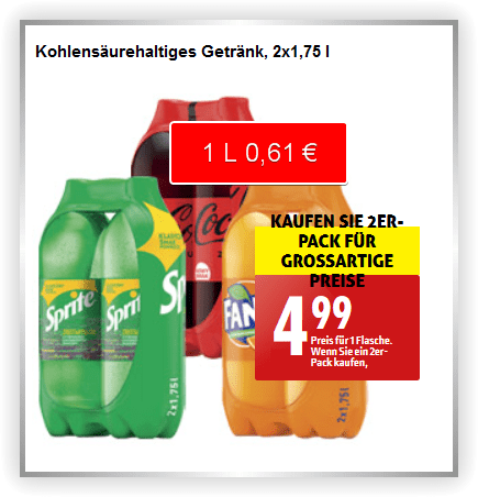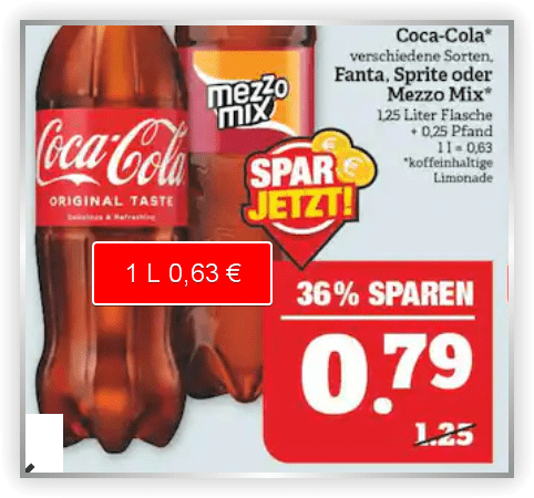 ![]() | Preisvergleich Cola Freeway | Polen (LIDL) 1 L = 0,19 € Deutschland (LIDL) 1 L = 0,25 € | Ersparnis: 24 % |